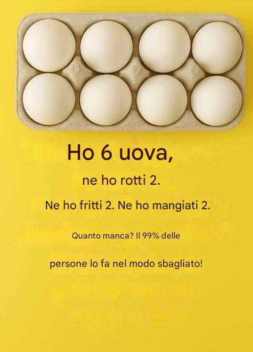 "Ho 6 uova. Ne ho rotte 2. Ne ho fritte 2. Ne ho mangiate 2. Quante uova mi sono rimaste?"